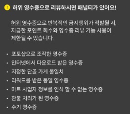 영수증 리뷰 작성 시 위와 같은 행위를 하면 포인트 회수 및 영수증 리뷰 기능 사용 불가 페널티가 부여된다고 합니다.