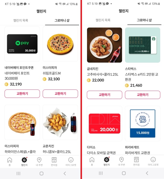 그로켓에서 모은 적립금은 네이버페이, 피자/치킨/햄버거 기프티콘, 편의점 금액권, 대형마트 금액권, 외식 금액권, 다이소 금액권 등으로 교환할 수 있습니다.