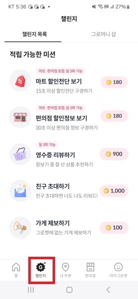 그로켓 화면 하단의 [챌린지]를 눌러보면 적립금 쌓는 방법들을 한 눈에 확인할 수 있습니다.
