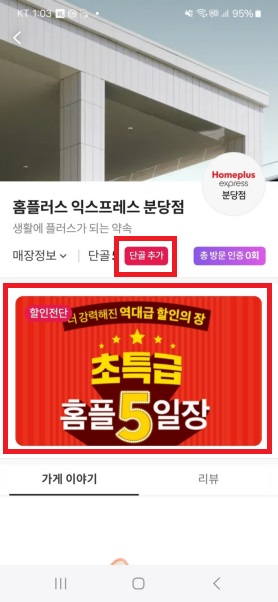 마트들을 단골로 등록해 놓으면, 단골 마트에서 할인전단을 게시한 경우 [홈]-[나의 단골가게]에 바로 표시가 되어 쉽게 확인할 수 있습니다.