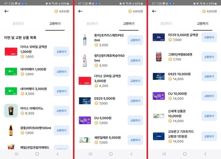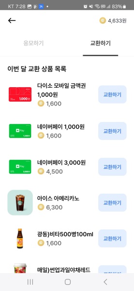 [교환하기]에서는 캐시로 네이버페이, 스타벅스 아이스 아메리카노, CU/GS25 금액권 및 기프티콘, 신세계 상품권, 교보문고 기프트카드 등의 상품으로 교환할 수 있습니다. 교환할 수 있는 상품은 그렇게 많은 편은 아니지만, 알짜배기 상품들이 다 갖춰져있기 때문에 사용하는데는 큰 지장이 없을 것으로 예상됩니다.