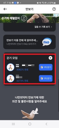 만보기와 관련된 또 하나의 컨텐츠로써 '걷기모임'이 있습니다. 여기서도 조건을 달성하면 보상을 받을 수 있습니다.