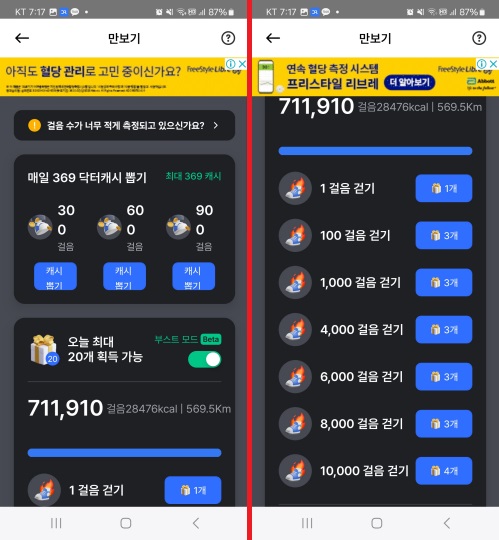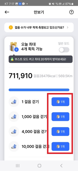 그나저나 기껏 만보 걸었더니 포인트박스 4개가 끝..? 소소하다고 해도 너무 소소한 것 같죠..? 게다가 아무리 광고가 나오지 않는다지만, 뭔가 노력에 비해 보상이 빈약하게 느껴집니다. 그렇다면 '부스트 모드'를 사용해보세요! '부스트 모드' 만보기를 사용하면 더 많은 보상을 획득할 수 있습니다.