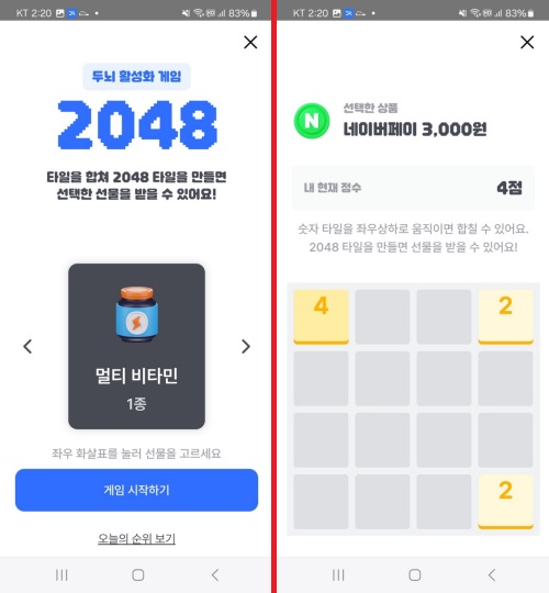 이 이벤트는 2048게임 룰을 적용하여, 2048 타일 만들기에 성공하면 멀티비타민, 네이버페이 등의 상품을 받을 수 있는 이벤트입니다. 옛날에 저는 한 판 했다 하면 2048 만들기는 껌이였는데, 지금은 감을 다 잊어버려서 최대 1024까지밖에 못가겠어서 깔끔하게 포기했습니다. 사람이 계속 해도 안되면 과감하게 포기할 줄도 알아야 합니다 (?)