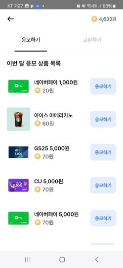 하지만 이러한 리스크를 감수하고도 도전할 만한 가치는 충분히 있다고 봅니다. 네이버페이, 스타벅스 아이스 아메리카노, GS25/CU 편의점 금액권 등에 응모하고 행운의 주인공에 도전해보세요!