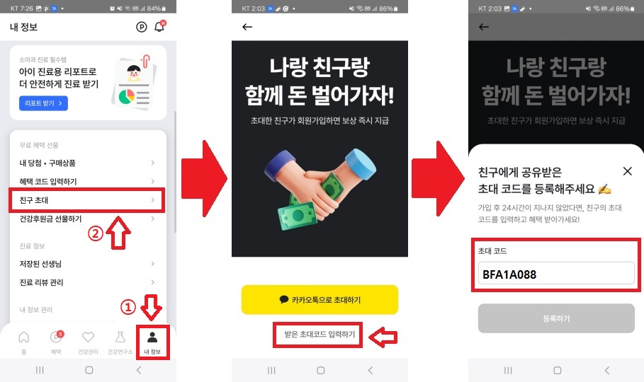 친구 초대 방법은 나만의닥터에 가입한 친구가 24시간 이내 여러분의 초대코드를 입력하면 됩니다. 정상적으로 완료하면 서로 500캐시를 받을 수 있습니다.