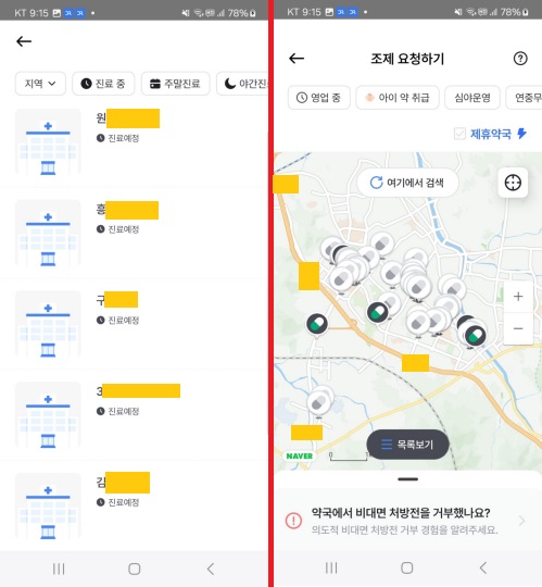 제가 이 스크린샷을 주말 저녁 9시쯤에 캡처했던 것 같은데, 그래도 제 주변에 열은 병원은 없어도(!?) 약국은 몇 군데 있더군요.