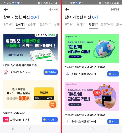 플레이스 미션 참여, 앱 설치, 인스타그램 팔로우, 유튜브 구독, 네이버뉴스 구독, 게임 플레이(조건 달성), 상품 구매, 보험상담, 서비스 회원 가입, 유무료 서비스 이용 등의 참여 방식으로 캐시를 받을 수 있습니다. 다들 한 번쯤 경험해보셨을 것이고, 광고 참여 방법은 눌러보면 다 나옵니다. 그대로 따라하면 되기 때문에 길게 말씀드리지는 않겠습니다.
