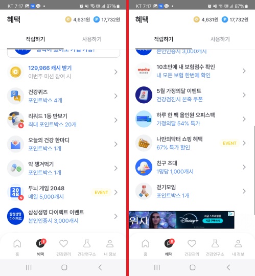 이건 '혜택' 탭에서는 찾아볼 수 없고, 하단의 '건강관리' 탭을 누르고 스크롤을 내려보면 찾아볼 수 있습니다.