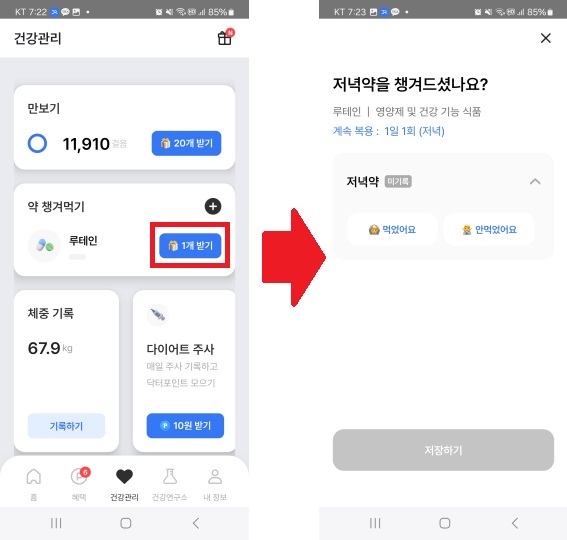 5) 약 챙겨먹기: 매일 먹는 약 복용 체크하고 포인트 박스 받기