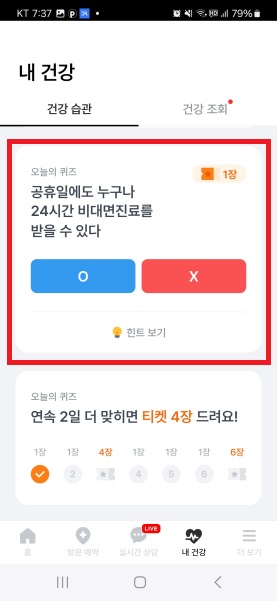 이번 퀴즈는 '공휴일에도 누구나 24시간 비대면진료를 받을 수 있다?' 입니다. 사실 정답이 O인 것이 명백한 것 같지만, 퀴즈 아래 [힌트 보기]를 통해 확실히 알아보도록 하겠습니다.
