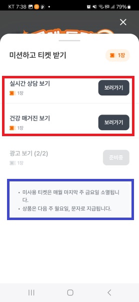 룰렛 돌리는 페이지 하단의 '미션하고 티켓 받기'를 손가락으로 위로 밀어 올리면 몇 가지 미션이 나옵니다. 여기서 미션 페이지에 일정시간 머무르면 추가 티켓을 획득할 수 있습니다. 저의 경험상 광고 보기의 같은 경우 맨날 '준비중'으로 나타나서 이용해본 적은 없습니다.