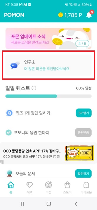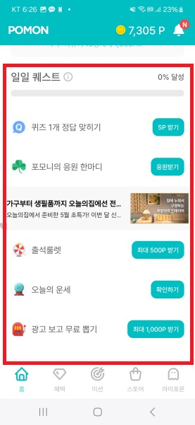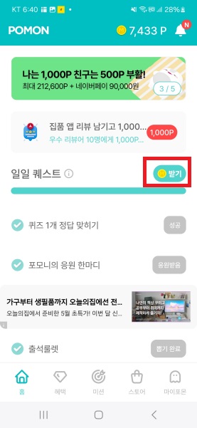 [홈]에서도 추가 혜택을 받을 수 있다는 콘텐츠가 있다는 점, 알고 계셨나요? [홈]에 있는 '일일퀘스트'를 완료하면 됩니다! 일일퀘스트 달성 조건은 간단합니다. 퀘스트 목록에 있는 것들을 전부 클리어하면 됩니다. 조건이 너무 까다로운 것 같다고요? 보너스 퀴즈 1회 완료, 포모니 응원 한마디 보기, 오늘의 운세 보기 등 달성하는데 별로 어렵지 않은 것들로만 구성되어 있습니다. 길어야 5분 정도면 됩니다.