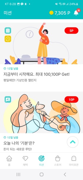 대부분의 미션은 '오늘 나의 기분 기록하기', '기상인증 챌린지', '만보 걷기 도전' 등 어렵지 않은 과제들로 이루어져 있습니다. 일상생활에서 쉽게 완료할 수 있죠!