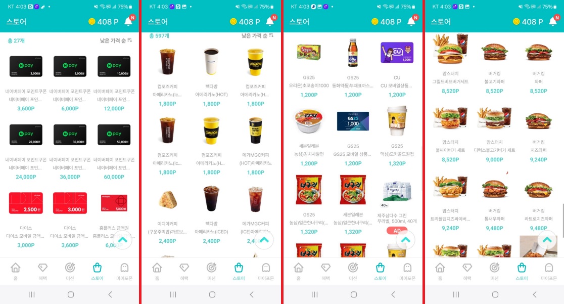 네이버페이, 다이소/이마트/올리브영/배달의민족 등 금액권, 도서/스트리밍 상품권, 카페 기프티콘, 편의점 금액권/기프티콘, 분식/햄버거/치킨 기프티콘 등 다양합니다. 역시 오래 운영된 어플인만큼 구매할 수 있는 상품들도 다양한 것이 좋네요. ^^ 여러분이 직접 확인해보세요!