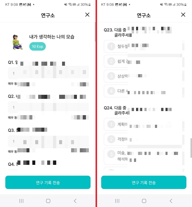 '연구소'의 대부분은 간단한 질문들이기 때문에 어렵지 않게 참여하실 수 있습니다. 이번 질문 주제의 경우 자신에 대한 질문들로 이루어져 있습니다. 자신이 일을 끝까지 잘 처리하는지, 창의력이 풍부한지 등 말이죠.