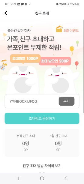 초대 방법은 누군가가 여러분의 초대코드를 입력하고 가입 or 여러분이 공유한 초대링크를 통해 가입하면 됩니다. 여러분의 인맥을 총동원해서 초대 포인트 챙겨가세요. 아니면 저처럼 블로그 같은 인터넷 커뮤니티를 통해서도 모집해보시는 것도 좋겠습니다.