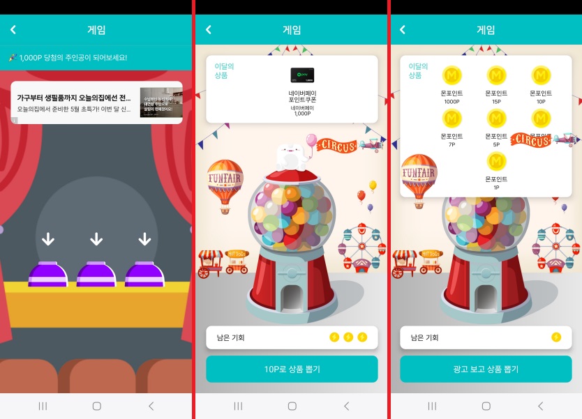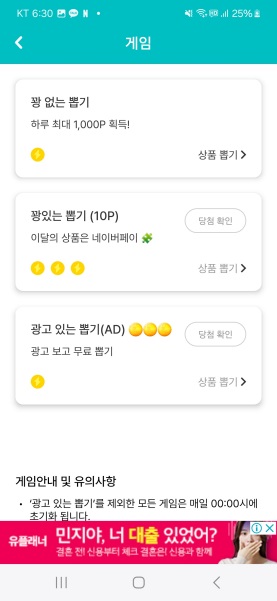 현재 게임 목록에는 총 3개(꽝 없는 뽑기, 꽝 있는 뽑기, 광고 있는 뽑기)가 있습니다. 게임이라고 해서 오락같은 것을 생각하셨겠지만 그냥 포인트/상품 뽑는 간단한 콘텐츠입니다ㅋㅋㅋㅋ... 뽑기 콘텐츠 자체를 '게임'으로 둔 모양입니다.