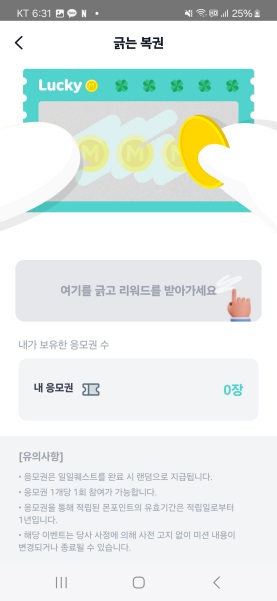 즉석복권 응모권은 [혜택] → [즉석복권 긁고 몬포인트 받기]에서 이용할 수 있습니다.