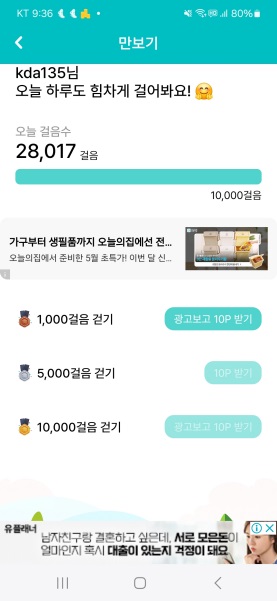 1천 걸음, 5천 걸음, 1만 걸음을 달성하면 각각 10포인트를 획득할 수 있습니다. 1천 걸음과 1만 걸음 보상은 동영상 광고를 시청하고 받을 수 있습니다. 스토어 상품과 포인트 비율로 따져봤을 때 만보기만으로 하루에 25원 가량 받아갈 수 있습니다. 예전에는 중간 걸음 보상이 더 있었는데, 업데이트가 진행됨에 따라 사라졌습니다. 아쉽게도, 혜택이 조금 축소된거죠.