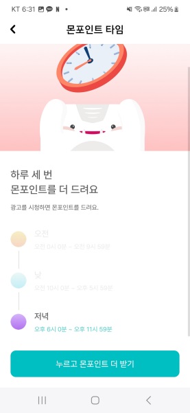 일정시간대에 동영상 광고를 시청하고 추가 포인트를 획득할 수 있습니다.