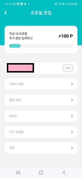 프로필에 입력할 내용으로는 전화번호, 거주지, 결혼 여부, 자녀수 등의 사적인 추가정보입니다. 조금 민감한 정보라고 생각하실 수도 있겠으나, 그냥 대충 입력하셔도 포인트몬스터를 이용하는데 지장이 없습니다. 포인트 적립을 목적으로 막 입력해도 된다는 겁니다. 포인트몬스터가 취향 분석 어쩌구 하는 어플이라 이런 프로필 정보를 입력하게끔 한 것 같은데, 이제 그것도 옛날 얘기고 지금은 별로 중요하지 않습니다.