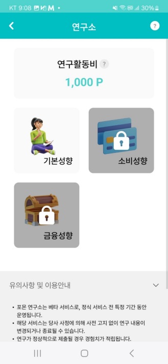 지금 소개해드리는 '연구소' 컨텐츠가 포인트몬스터가 강력하게 내세우는 타이틀인 '취향'과 그나마 관련되어 있다고 할 수 있을 것 같습니다. 좀 더 자세히 말씀드리자면, 취향 설문조사라고 볼 수 있을 것 같습니다. 연구소 컨텐츠는 [홈] 화면에서 찾아볼 수 있습니다.