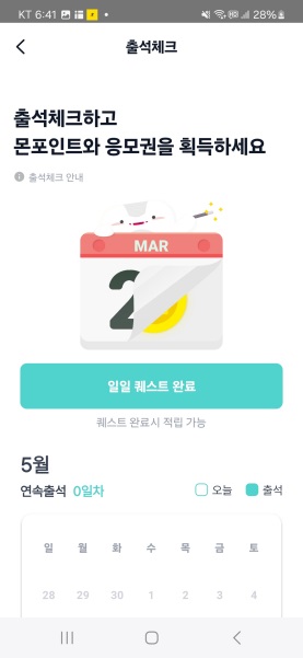 일일퀘스트를 완료하면 출석체크라는 것을 할 수 있게 됩니다. 출석체크에서는 포인트와 긁는 즉석복권 응모권을 획득할 수 있습니다.
