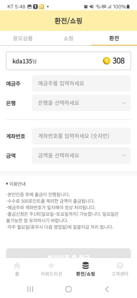 미션, 일일룰렛 돌리기, 친구 초대 등으로 획득한 캐시는 '환전/쇼핑'에서 다양한 상품으로 교환하거나 현금으로 출금할 수 있습니다. 보람이 가장 크게 느껴지는 순간이죠! 😋