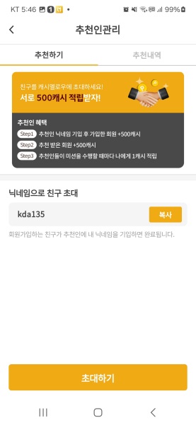 - 추천인을 입력하고 가입하면 500캐시를 받아요!