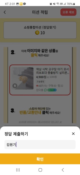 세 번째, 쇼핑통합미션입니다. 아까 보았던 해시태그 미션과 거의 유사합니다. 미션에서 제시하는 상품과 일치하는 상품을 찾고 정답을 입력하면 됩니다. 단지 이번에는 상품의 해시태그가 아니라 대표자명을 찾아야한다는 점만 다를 뿐이죠. 이것도 하나 클리어하는데 평균 1분 정도 걸리는 것 같습니다.