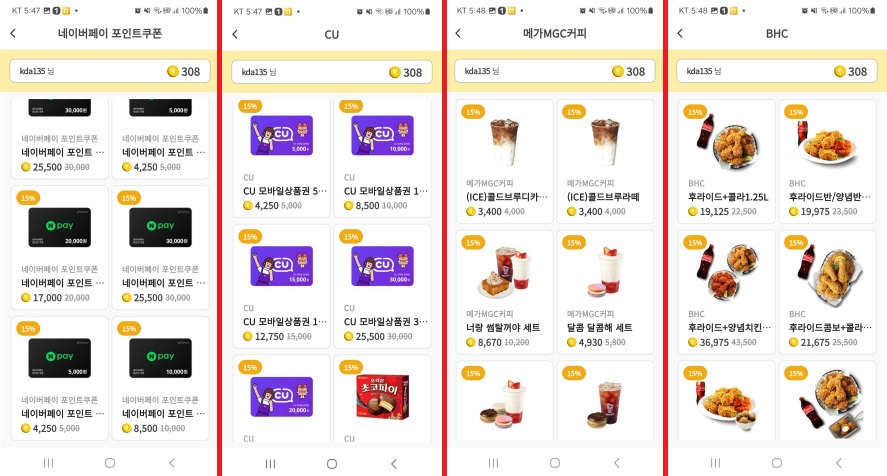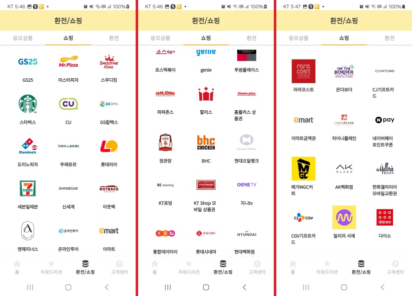 네이버페이, 편의점, 카페, 햄버거, 피자, 치킨, 백화점, 다이소, 외식 등 제가 위 3등분한 사진에도 다 못담을 정도입니다. 그렇기에 여러분의 좋아하실 만한 것, 찾으시는 것, 필요로 하는 것 무엇이든 다 있다고 감히 장담합니다.