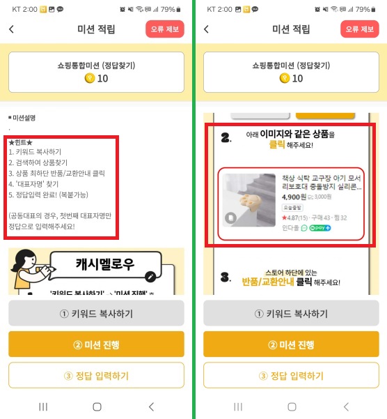 지금까지 정답미션 3종류를 살펴보셨습니다. 정답미션은 참여 보상으로 10캐시를 받습니다.