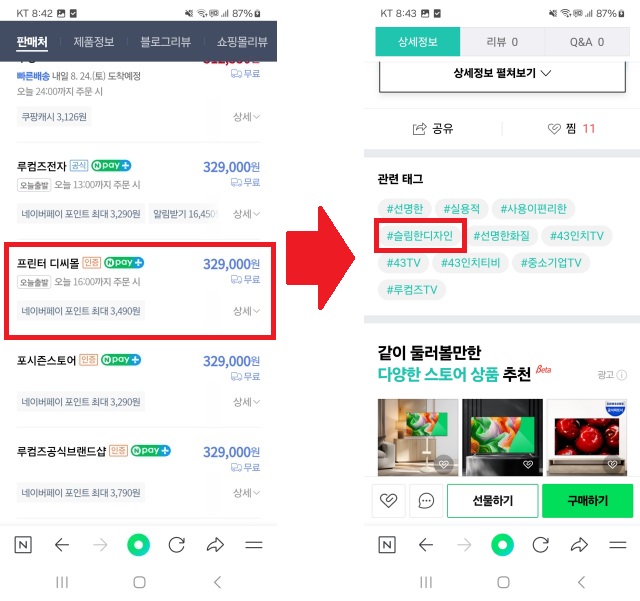 8) 상품 페이지에서 스크롤을 아래로 내려 '관련 태그' 중 4번째 해시태그 확인