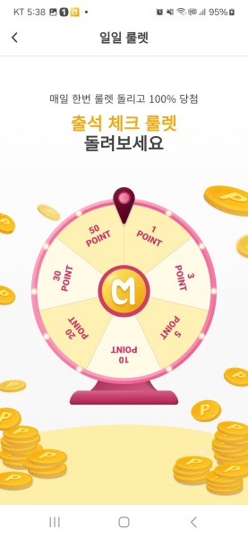 하루에 한 번, 일일룰렛 돌리고 캐시를 받을 수 있습니다.