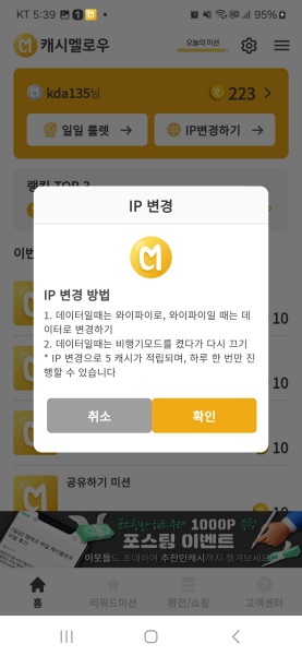 IP 변경하면 5캐시를 보상으로 받습니다. 일 1회 가능합니다.