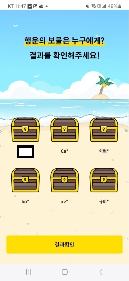 게임 방법은 보물 상자를 하나 선택하고, 그 안에서 보물이 나오면 100캐시를 얻게 됩니다.