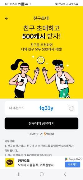 100명 초대를 완료하면, 와! 무려 5만 캐시라는 어마어마한 금액이 나오는군요!