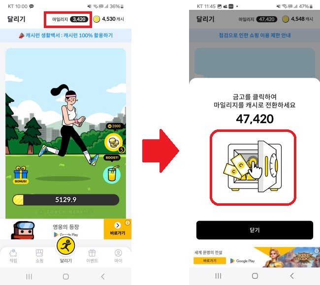 상단의 '마일리지' 버튼을 누르고 나타난 금고 버튼을 터치하면 캐시로 전환됩니다.