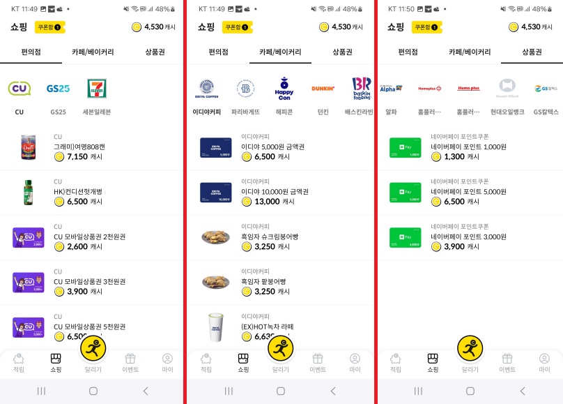 캐시런에서 적립한 캐시는 앱 내 [쇼핑]에서 사용할 수 있습니다.
