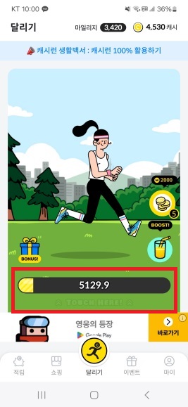 마일리지바를 터치하면 지금까지 자동으로 쌓인 마일리지를 받을 수 있습니다.