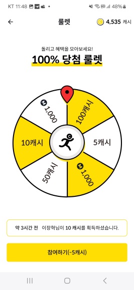 1천 마일리지부터 시작해서 최대 100캐시까지 당첨될 수 있습니다.