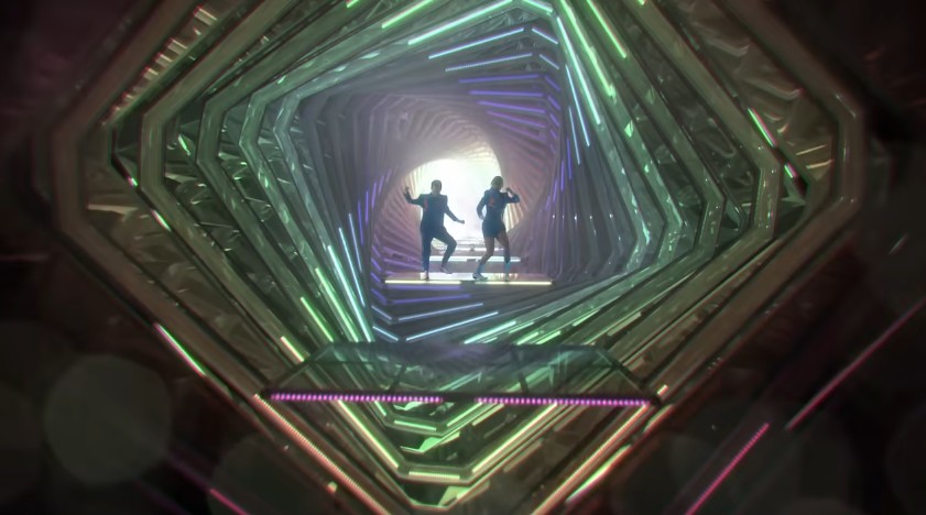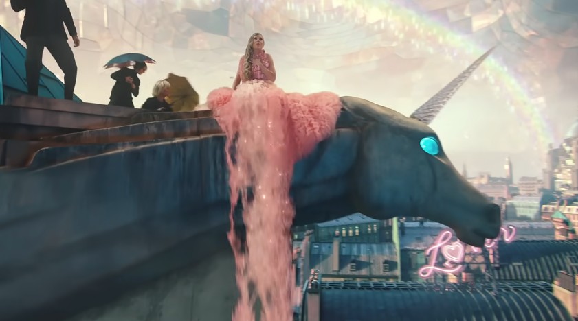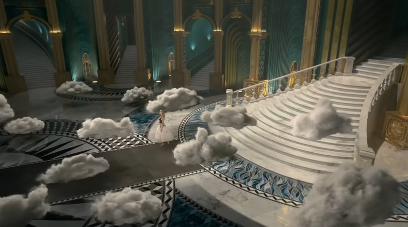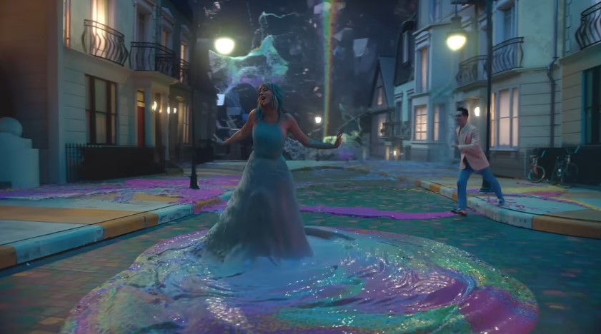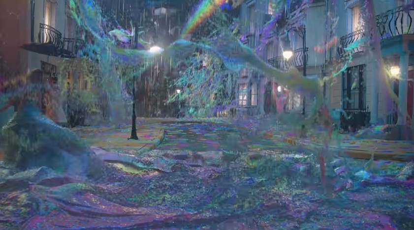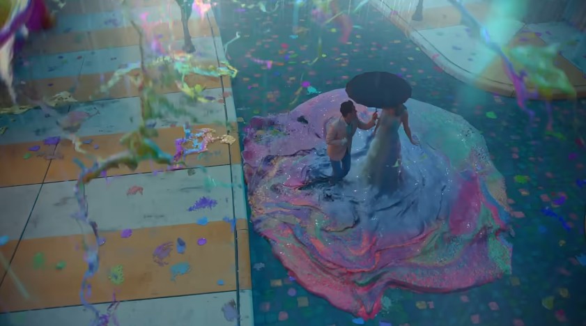 드레스에서 분홍색 마법 가루가 끝없이 흘러내리는 여자의 옆에 도착한 남자.