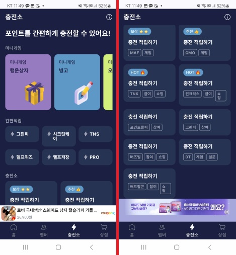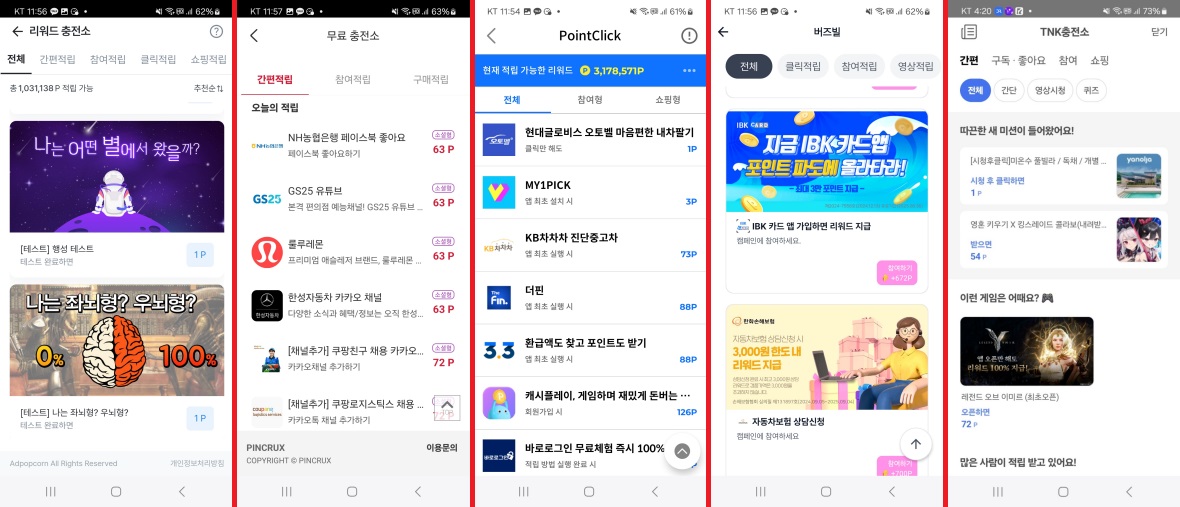 그런데 충전소 갯수가 평범하지 않습니다. 포인트 충전소만 무려 10개가 넘어갑니다. 제가 지금까지 많은 어플을 해왔지만, 10개 넘어가는 경우는 드뭅니다. 정말 아예 작정하고 만드신 모양입니다.