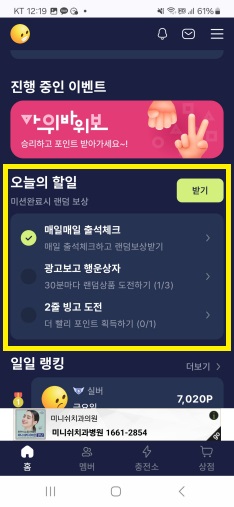 할일을 전부 완료하면 보너스 포인트를 받을 수 있습니다. '할일'이라는 것도 출석체크나 행운상자 열기 정도로 크게 어렵지 않습니다.