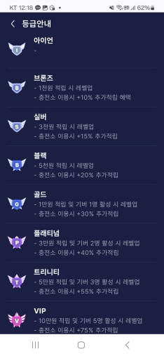 등급은 아이언부터 VIP까지 총 8개로 구성되어 있으며, 이전 달의 충전소 이용량에 따라 이번 달의 등급이 결정됩니다. 골드 등급 이상부터는 활성 기버라는 것도 필요하니, 참고하시기 바랍니다. 활성 기버는 최근 한 달 동안 충전소 이용을 한 기버를 뜻합니다. 기버에 대한 내용은 아래에서 말씀드리겠습니다.