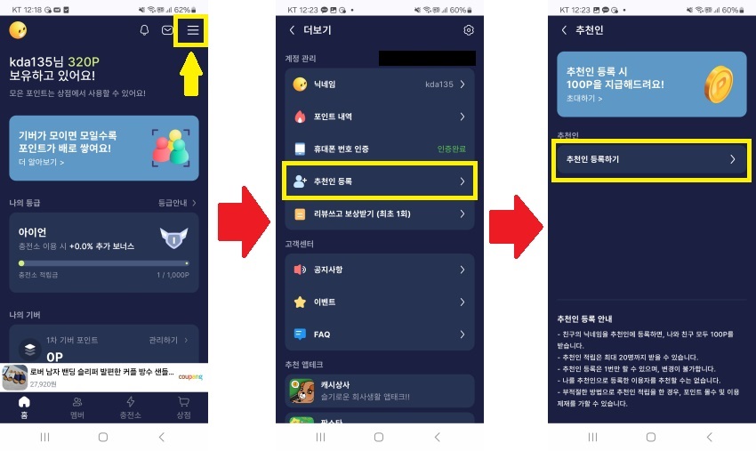 기테 추천인 입력은 가입 후에 할 수 있습니다. 방법은 다음과 같습니다.