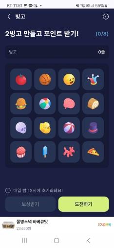 랜덤으로 그림을 뽑아서 빙고를 완성하면 포인트를 받을 수 있습니다. 완성한 빙고 수가 많을수록 더 많은 보상이 지급됩니다! 그림 뽑기는 최대 8번까지 참여할 수 있으며, 매일 0시에 빙고판이 초기화됩니다.