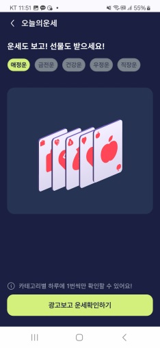 영상 광고를 보면 오늘의 운세가 나오며, 포인트가 적립됩니다. 재미로 오늘 운세도 흘깃 보시고, 포인트도 챙겨가시죠!