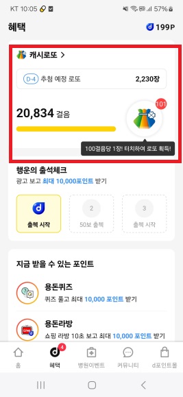 캐시로또는 매일 1장씩 조건없이 제공되며, 100걸음당 1장씩 제공됩니다. 걸음으로는 하루 최대 100장까지 받을 수 있습니다. 매일 만보 걷고 캐시로또도 받아보세요. 캐시로또는 무작위 번호로 발급됩니다.
